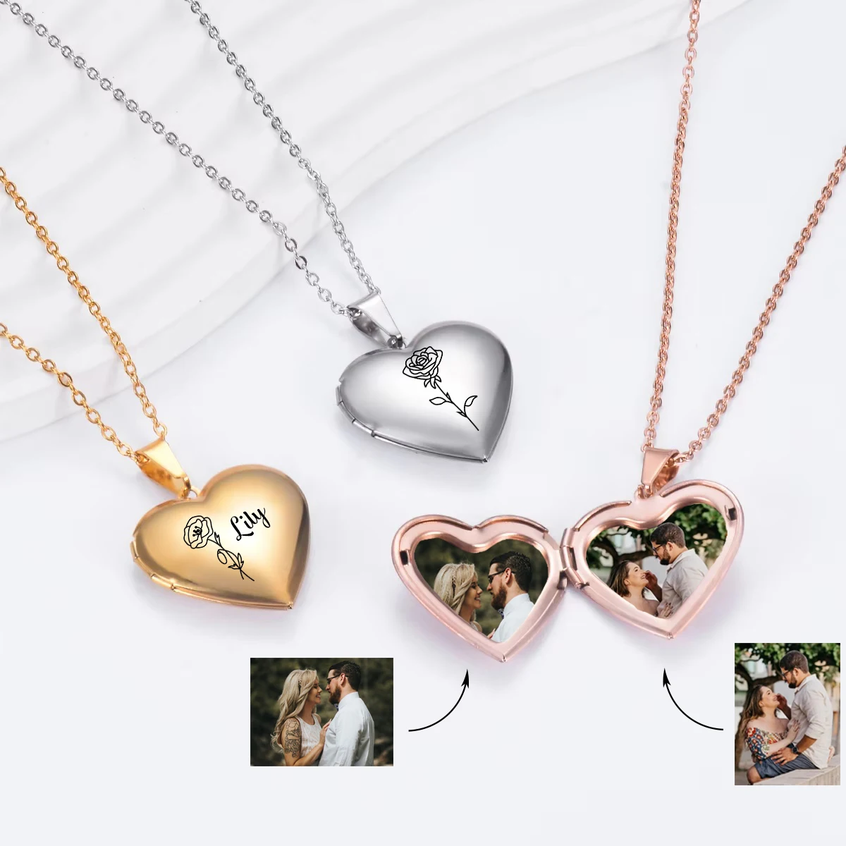 Custom Personalized Heart Birth Flower Locket Necklace for Women Stainless Steel Photo Locket